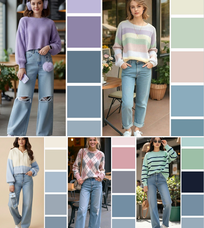 Светлые джинсы весной — это как чистый холст, на который так и хочется нанести первые краски пробуждающейся природы. В паре с нежными оттенками они создают образы, наполненные невесомостью и внутренним сиянием. Сиреневый, напоминающий цветущую сирень, бледно-зеленый — словно первая листва, или солнечный бледно-желтый дарят ансамблю удивительную мягкость и трогательную хрупкость. Такие комбинации выглядят очень естественно, благородно и по-настоящему весенне — в них чувствуется свет, тепло и обещание скорого лета.